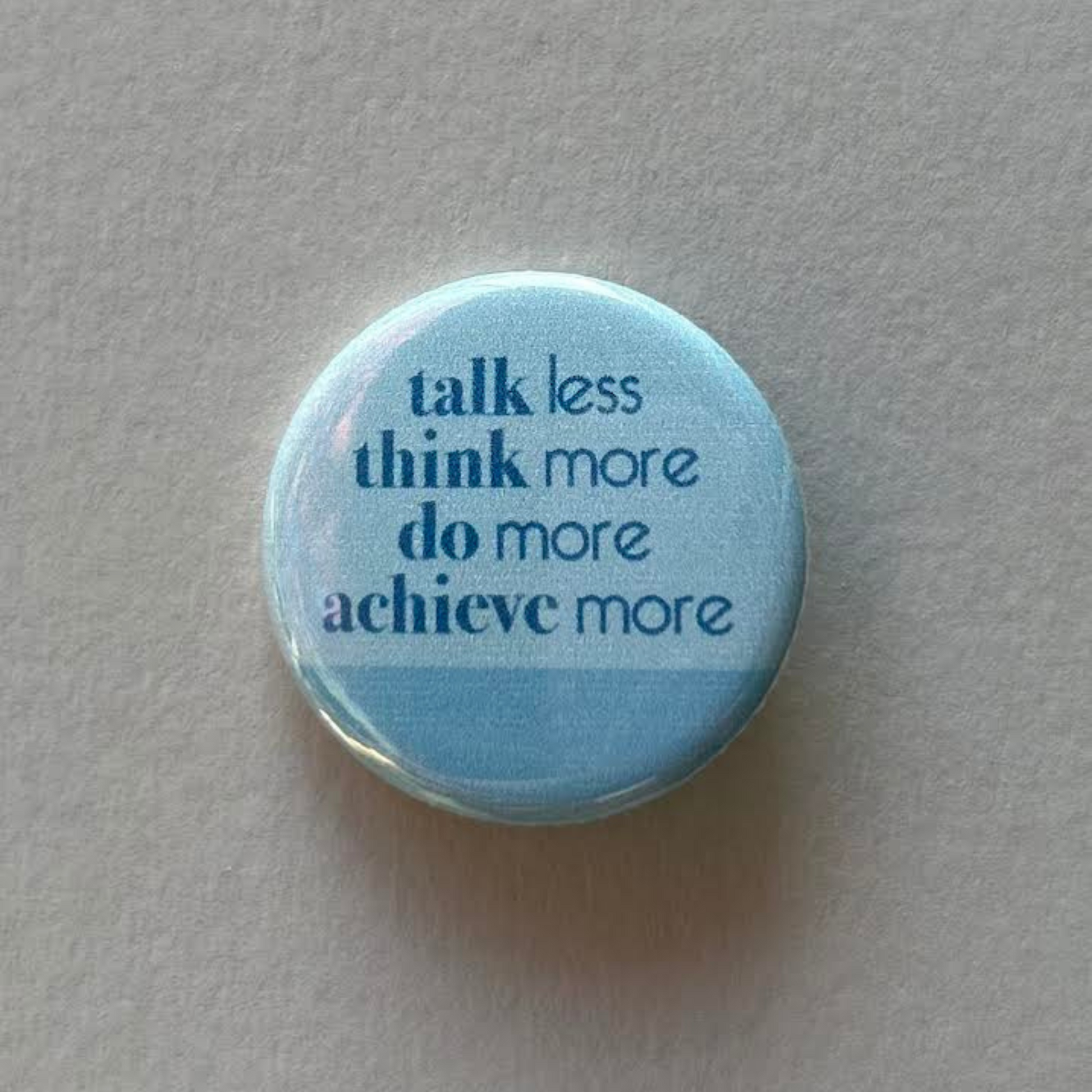 Stay focused and motivated with this button pin featuring the powerful phrase, 'Talk Less, Think More, Do More, Achieve More.'